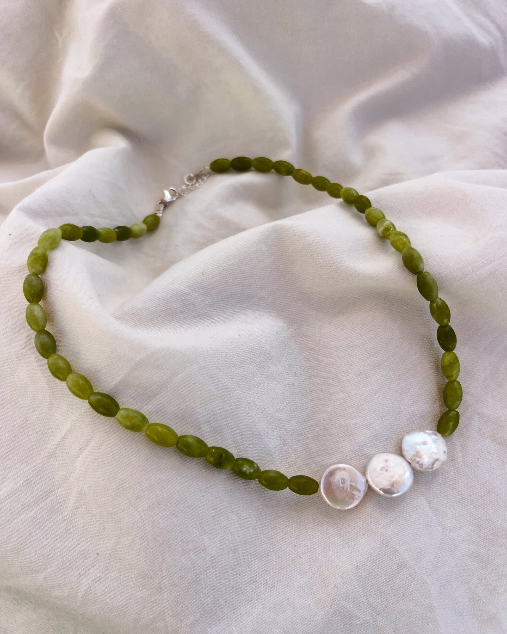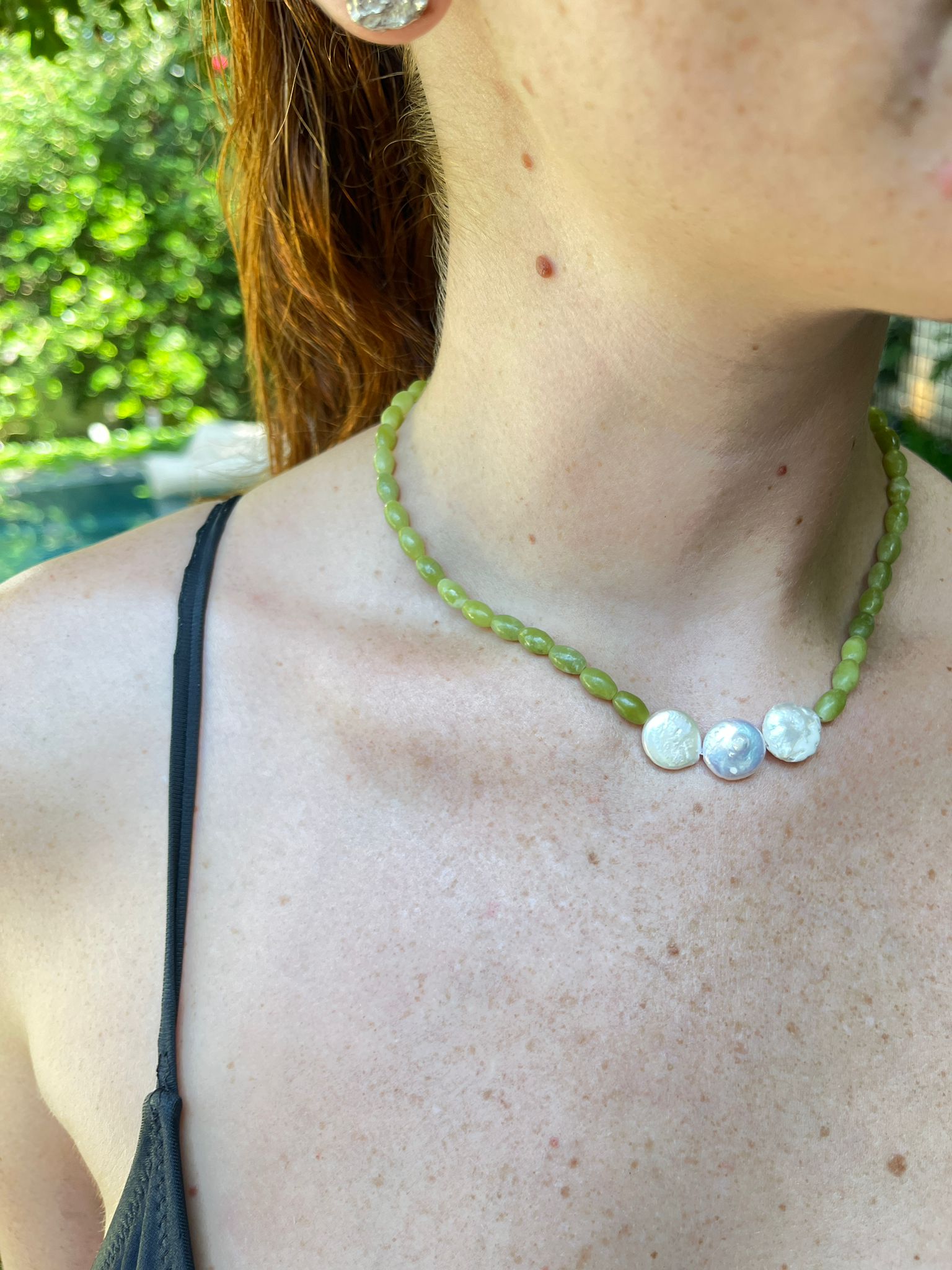 מחרוזת אבן חן ג'ייד ירוקה ועדינה בשילוב פנינים אמיתיות