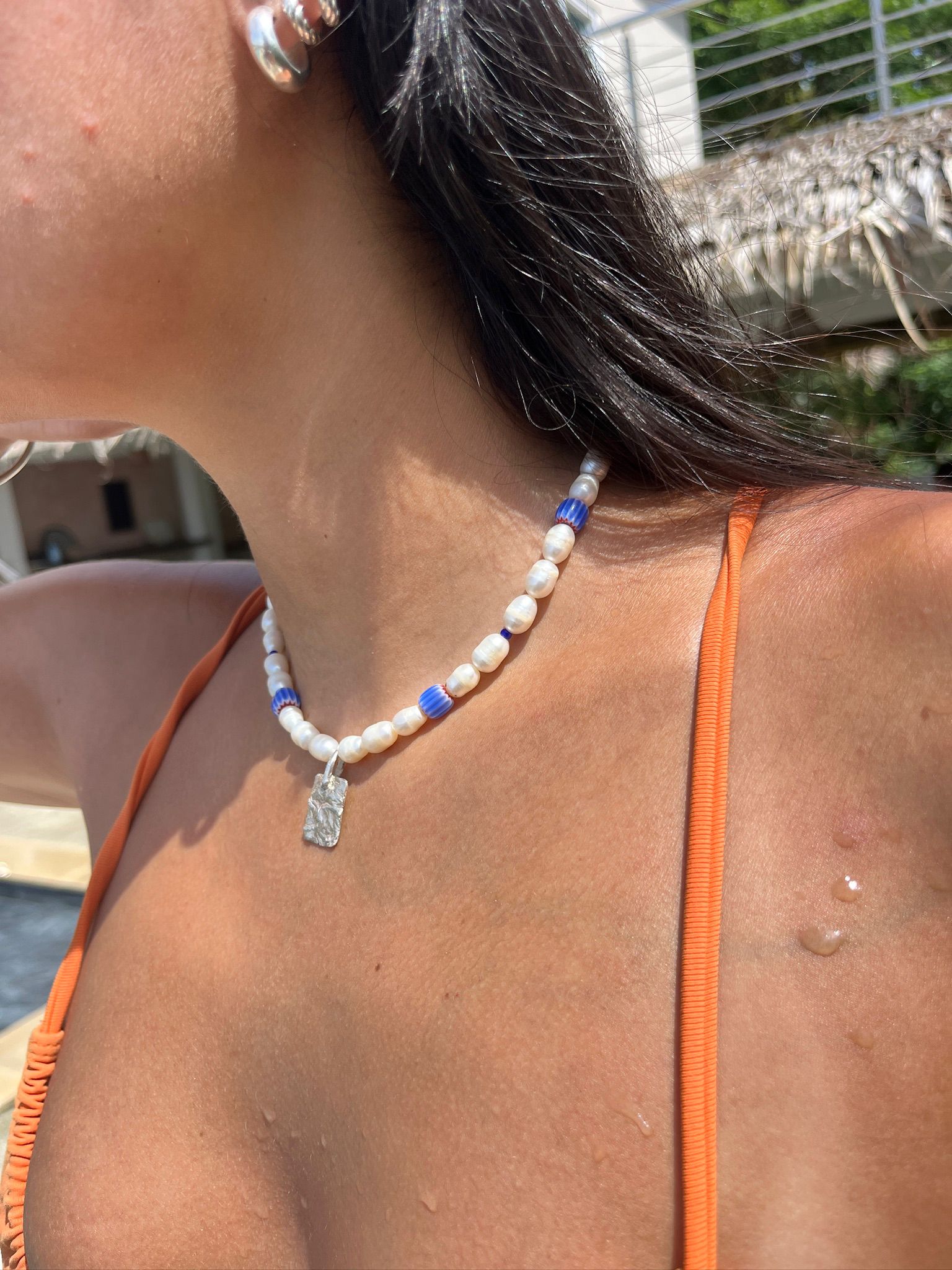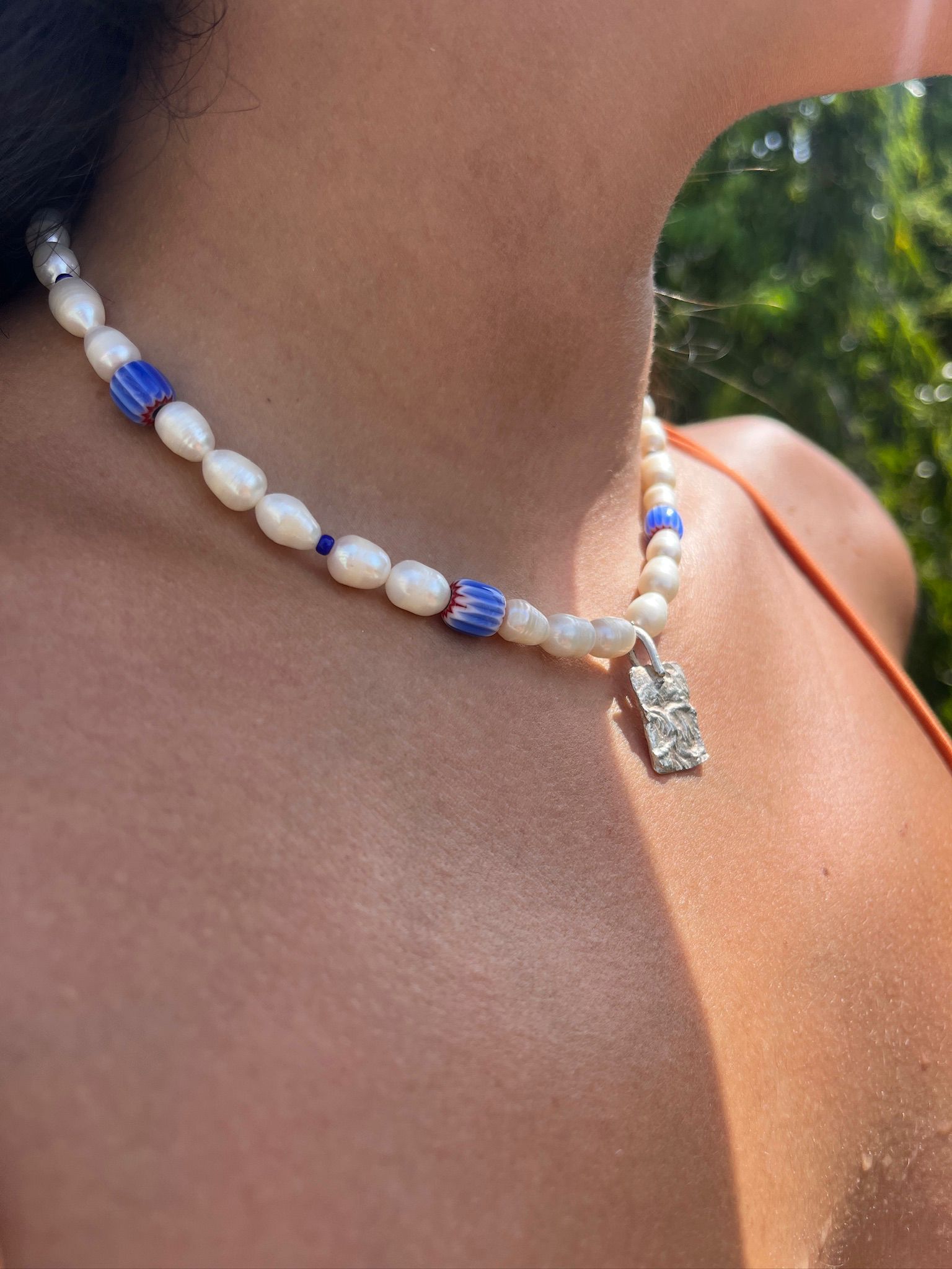 מחרוזת פנינים אמיתיות עם תליון לוסי ונגיעות קיץ כחולות